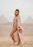 This kimono comes in two variations - Silk ( Premium option, higher price point) and Viscose Satin ( similar look and feel to silk, vegan and reduced price point.) The ‘Egyptian Sand’ color kimonos are made from viscose Satin. The ‘Golden Goddess’ and ‘Smokey Lavender’ variations are made from silk.