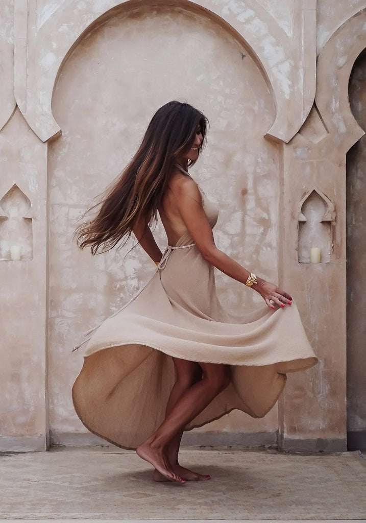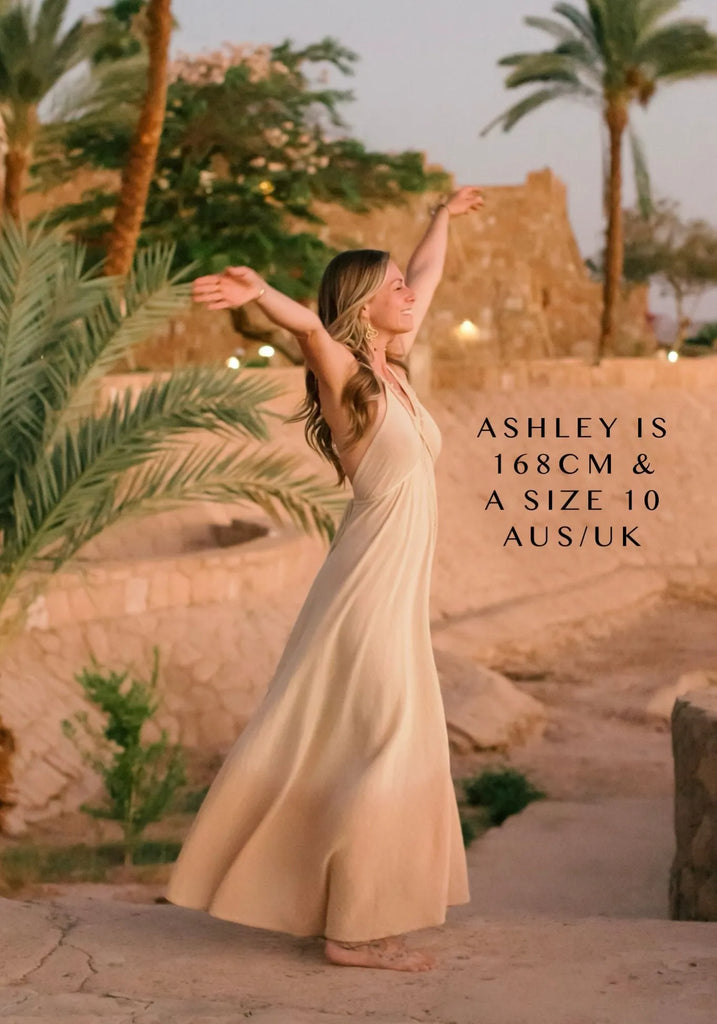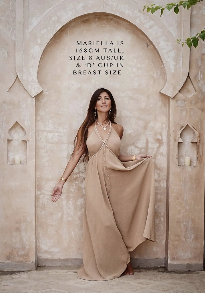 Perfect for twirling, this beautiful Strappy dress with hand plated tassel detailing is my modern day take on this Grecian/Egyptian time in history. The material is hand woven by loom & made with a blend of cotton and Rami. The straps are long and can be tied different ways to give you versatile looks with the dress.  It’s one size and fits most women from size 8-16 AUS/UK with a B-F cup breast size. If you are 167cm or shorter you may need to have the hem length tailored.